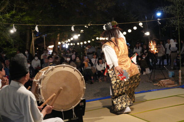 境内ではご神木の大楠の前に舞台が設えられ、篝火の焚かれる幽玄な雰囲気の中で厳かに、時にはユーモラスに神楽が舞われます。