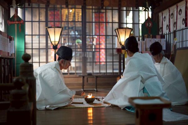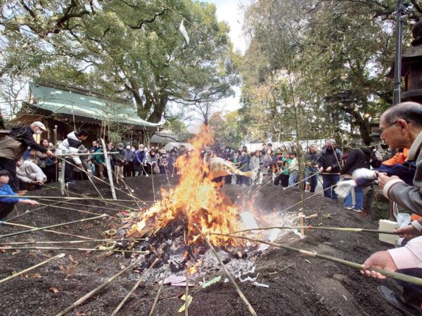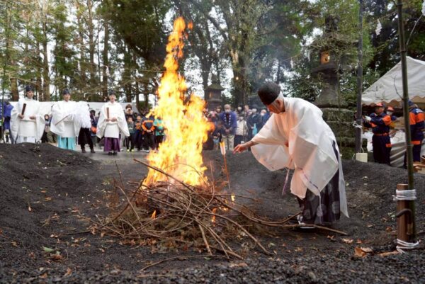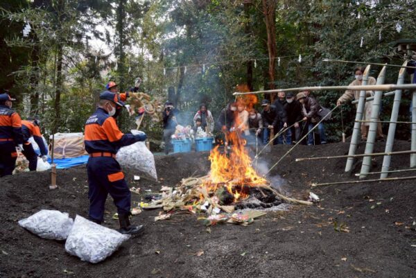 古式に則って採火した忌火により、正月にお飾りしたしめ飾りや門松をお炊き上げし、歳神様はその煙に乗って帰って行かれるとも言い伝えられます。